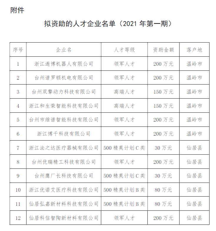 根據《臺州市“以資引才”引進人才團隊實施辦法》(臺人才領〔2020〕40 號)的規定,我市啟動了天使夢想基金資助申報工作。經企業自愿申報、評審委員會篩選、天使夢想基金管理委員會審議,擬對12家人才企業進行資助,現將名單予以公示。如有意見,可向市金投集團反映。