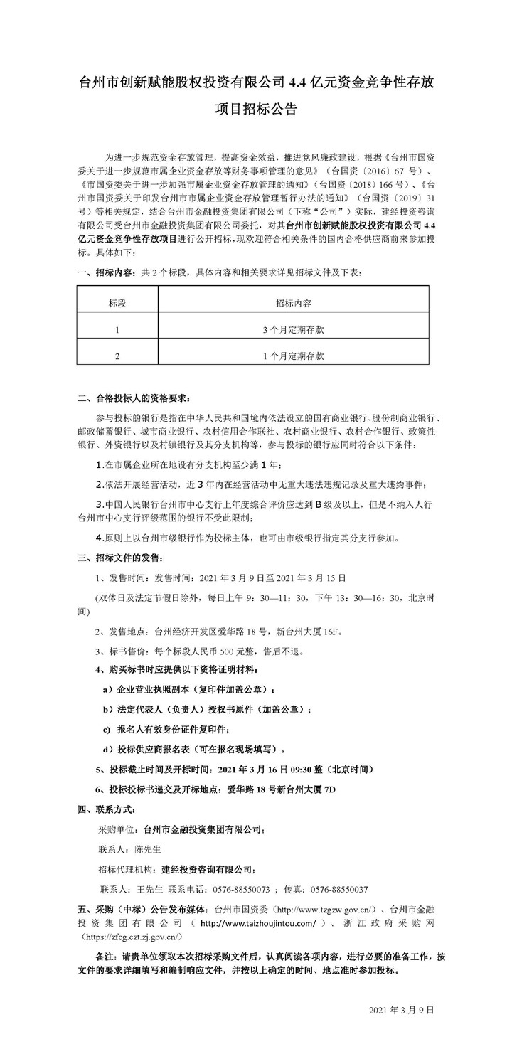 臺州市創新賦能股權投資有限公司4.4億元資金競爭性存放項目招標公告