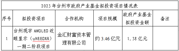 根據(jù)《臺(tái)州市政府產(chǎn)業(yè)基金管理辦法》(臺(tái)財(cái)企發(fā)〔2021〕6號)等有關(guān)規(guī)定,為發(fā)揮政府產(chǎn)業(yè)基金引領(lǐng)作用,臺(tái)州市政府產(chǎn)業(yè)基金擬投資的1個(gè)項(xiàng)目(定向基金),已由臺(tái)州市金融投資集團(tuán)有限公司決策委員會(huì)(基金管理委員會(huì))審議通過,現(xiàn)將擬投資項(xiàng)目予以公示。如有意見,可向市金投集團(tuán)反映。